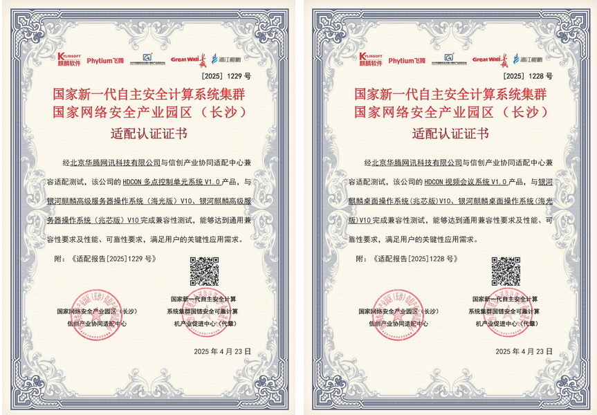 在國(guó)家新一代自主安全計(jì)算系統(tǒng)集群及長(zhǎng)沙國(guó)家網(wǎng)絡(luò)安全產(chǎn)業(yè)園區(qū)的戰(zhàn)略引領(lǐng)下,北京華騰網(wǎng)訊科技有限公司迎來(lái)重要里程碑——華騰HDCON視頻會(huì)議系統(tǒng)、多點(diǎn)控制單元系統(tǒng)順利通過(guò)信創(chuàng)產(chǎn)業(yè)協(xié)同適配中心嚴(yán)格認(rèn)證,與銀河麒麟操作系統(tǒng)(兆芯/海光版)V10完成全棧適配,